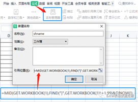 公式 – 名称管理器 – 新建名称 – 输入自定义的名称:shname,在引用位置中输入公式:=MID(GET.WORKBOOK(1),FIND(“]”,GET.WORKBOOK(1))+1,99)&T(NOW())