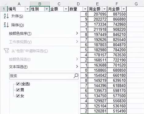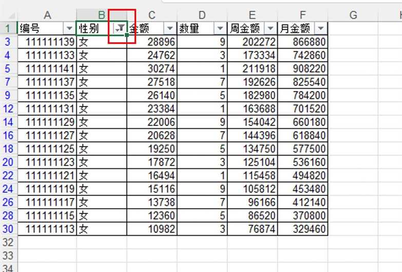 完成筛选后,如2所示,性别字段右侧会出现筛选图标,表示该字段包含筛选条件。