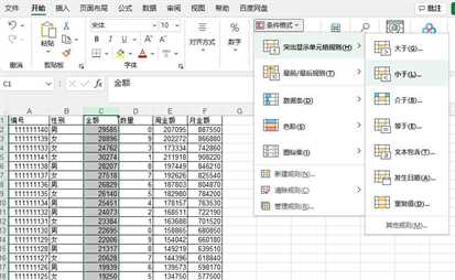 比如,为金额小于某个值的单元格设置颜色,可先选中“金额”所在的C列,然后依次单击突出显示单元格规则-小于选项。