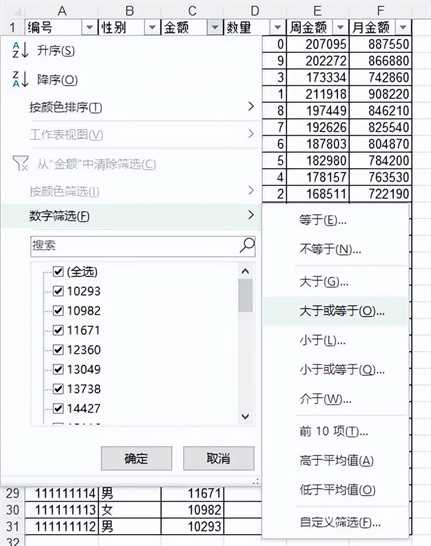 除了进行简单的选项筛选外,针对数字型的数据还可进行“数字筛选”,即按照数值条件进行筛选,比如“等于”、“大于”某个值等。