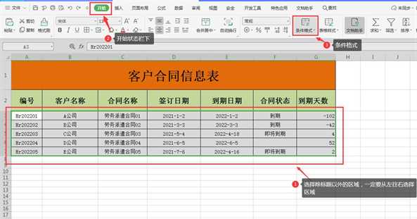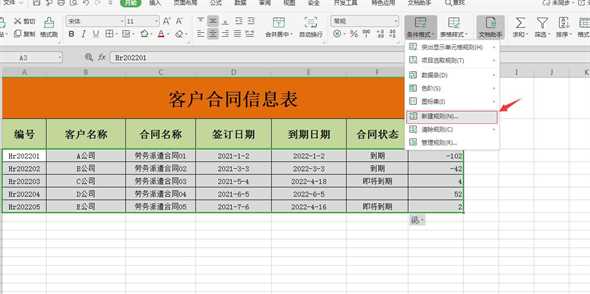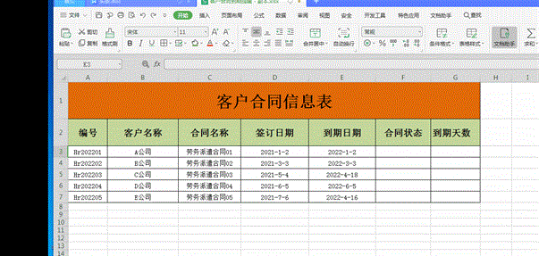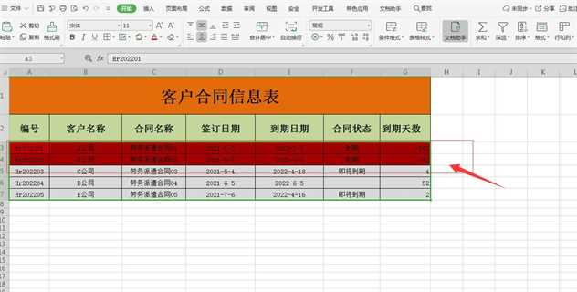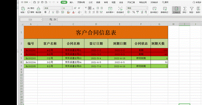 首先,我们打开一张客户合同信息表,这张表格是做好的效果,如下图(各位小伙伴如需要这个表格,请关注留言),像这样一张表格,我们就可以根据到期时间让系统自动提醒合同是否到期或者即将到期,根据日期自动填充颜色。下面就一步步教大家如何制作这样的表格。