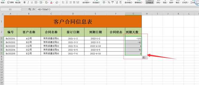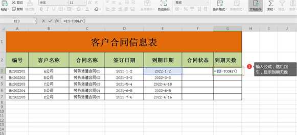 1、首先打开这张表格,在到期天数下面的在空白格中输入公式,=到期日期-TODAY(),这里的“到期日期”为E3的单元格的日期,TODAY函数是得出今天的日期,利用两者之差算出到期天数,前面“到期日期”的具体数值根据自己表格确定,我的这张表输入公式 =E3-TODAY() 如下图