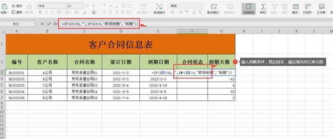 在“到期日期”的空白单元格中,输入公式 =IF(G3>30,””,IF(G3>0,”即将到期”,”到期”)),然后回车,填充其它空白单元格。