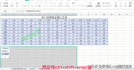 公式法第三步在选中的空白单元格直接输入函数公式=TRANSPOSE(原表格区域),然后在函数括号内单击选中整个原表格,最后按Ctrl shift enter组合键即可。