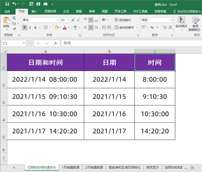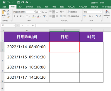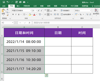将下图工作表A列中的“日期和时间”拆分为“日期”列和“时间”列,拆分后的效果见B列和C列。