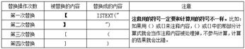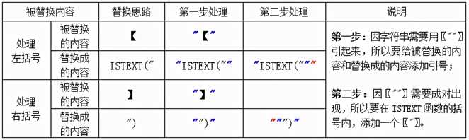 因为注释的括号是一对,所以这里要进行两次替换,依次将左括号和右括号替换成以下内容:①替换左括号〖【 〗→〖 ISTEXT(” 〗;②替换右括号 〖 】〗 → 〖 “) 〗,这个就是注释内容的处理思路。