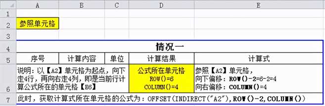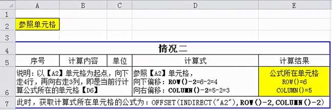 此时,获取当前行计算公式所在单元格的公式为:OFFSET(INDIRECT(“A2”),ROW()-2,COLUMN()),其原理和详细说明,见下图。