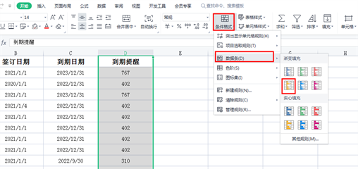 4、这样颜色数据条和到期截止天数都会显示出来啦!~效果展示如下图: