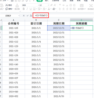 1、首先,我们在D2单元格中输入「=」,然后选择对应的合同到期日,并选择减去 TODAY 函数(该函数的意思是获取当天的日期)。即公式【=C2-TODAY()】