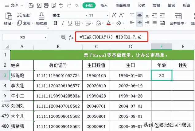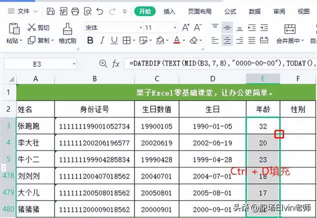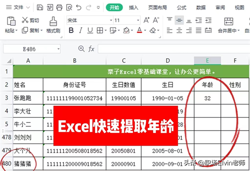 下面栗子老师教你3招获取年龄的使用方法吧,30秒就学会哦,5秒做好这份478条员工年龄数据。