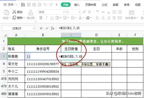 1、首先在【生日数值】下单元格中输入:=MID(B3,7,8),截取从第7位开始,8个数字的年月日,并按【回车键】,得出数值19900105。熟练操作以后,可以省略这步哦,栗子老师为了让大家更加清晰了解,所以分步骤讲解。