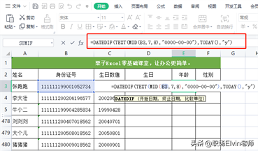 3、DATEDIF()函数使用:在【年龄】下输入=DATEDIF(D3,TODAY(),”y”) 或=DATADIF(TEXT(MID(B3,7,8),”0000-00-00″) ,TODAY(),”y”)。