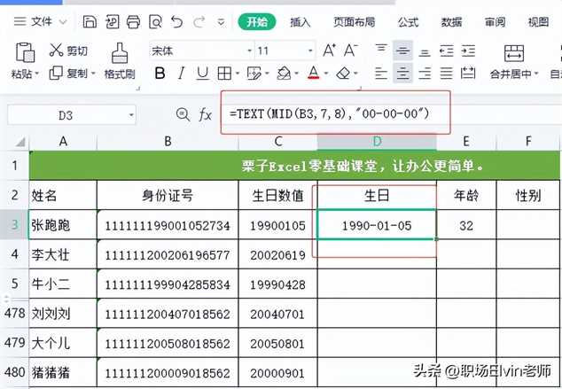2、TEXT()函数:用TEXT()函数将数值格式化为文本,TEXT(值,数字格式) ,在【生日】列输入公式=TEXT(MID(B3,7,8),”0000-00-00″) 或=TEXT(C3,”0000-00-00″),最终得出1990-01-05。