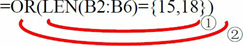 ①使用LEN函数查找B2:B6单元格区域中的字符文本长度是否等于15或者18。