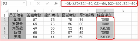按“Enter”键即可根据员工3门技能考核来判断是否全部达标或平均成绩是否达标,如果两者中有一项结果为TRUE,那么最终结果为TRUE;否则结果为FALSE。