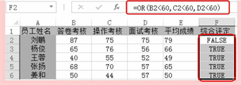 判断B2、C2、D2单元格中的数值是否满足有一项大于等于60的条件,如果是则返回TRUE,否则返回FALSE。