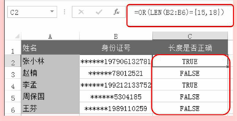 身份证号码具有15位和18位两种长度形式。使用OR函数可以判断当其长度为15或18位中的任何一个时都是正确的。