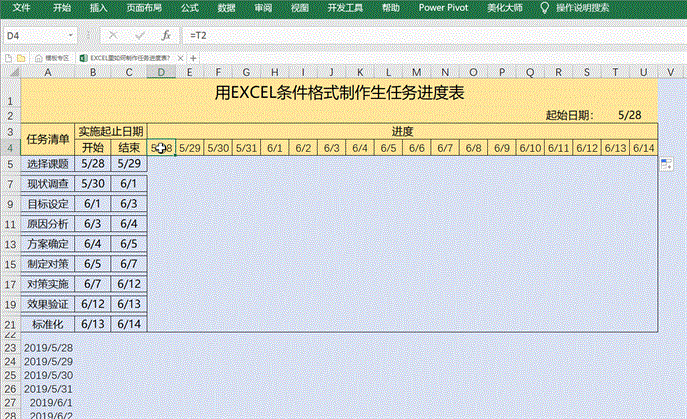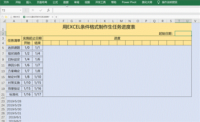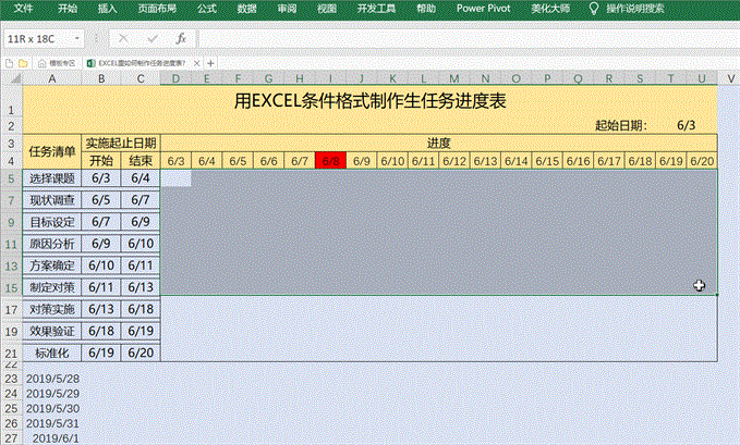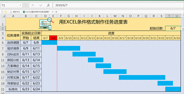 最佳答案方法一:使用条件格式制作任务进度表我用一个案例分享用条件格式制作任务进度表的方法,这种方法可以选择起始日期,并用红色突出显示当天的日期,用红色边框线将进度情况进行标识,效果图如下:1、 设置起止日期下拉列表。在进度表旁边输入要放入下拉列表的日期,案例中我们在A23:A33区间输入2019-5-28至......