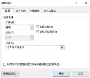 1、 设置起止日期下拉列表。在进度表旁边输入要放入下拉列表的日期,案例中我们在A23:A33区间输入2019-5-28至2019-6-7的日期→点选T2单元格→【数据】→【数据验证】,然后在数据验证对话框中,验证条件选择【序列】,来源点选$A$23:$A$33后确定即可。