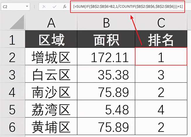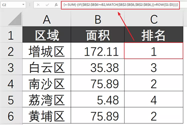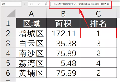 在这个逻辑值数组中,TRUE 的数量就是唯一值列表中大于或等于 B2 的单元格数目,即为排名。