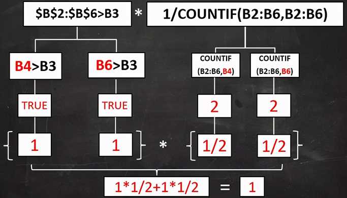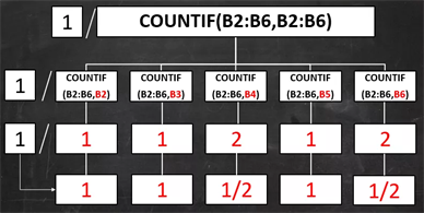 以 B4 和 B6 为例,重复次数为 2,权重 1/COUNTIF 则为 1/2,它们与 B3 比较的结果都为 TRUE,也就是 1,于是它们的乘积和为 1*1/2+1*1/2=1。