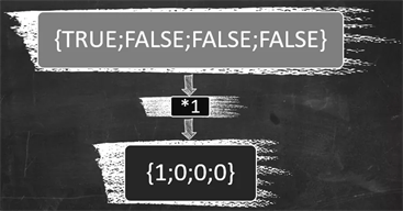 于是我们将步骤 2 中的逻辑值数组与 1 相乘,将逻辑值数组转变为数值数组(TRUE 为 1,FALSE 为 0){1;0;0;0}。
