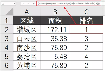 我们通过 IF 函数判断,取得一组满足条件的间隔值,FREQUENCY 函数求排名区域被该组间隔值分拆成的各个值域中数值的个数,这组频数中的非 0 值个数,即为排名值。