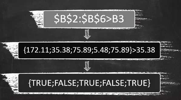 该公式片段将生成一组判断,计数区域 B2:B6 中的每一个数值,是否大于 B3 的逻辑值。