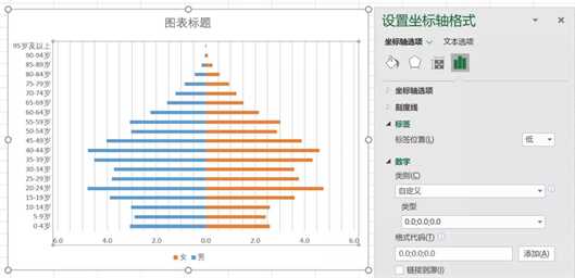 Step-04:在标签里选择【标签位置】为低,【数字】里面选择输入自定义类型为“0.0,0.0,0.0”,将坐标轴中的负数变为正数。如下图所示。