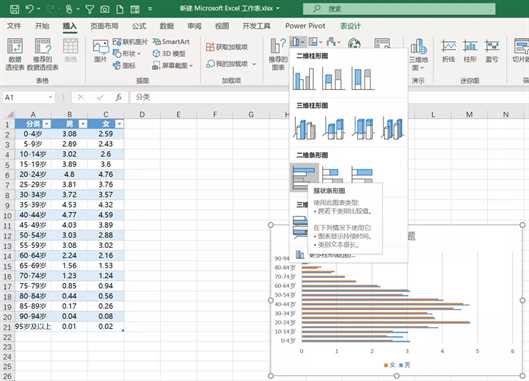 最佳答案如下图所示,是某地男女人口的占比金字塔图。这样的图表是怎么样绘制出来的呢?今天和大家一起来学习这类图表的制作过程。首先准备数据源如下:具体的操作步骤如下:Step-01:选中数据区域,依次单击【插入】-【条形图】-【二维条形图】-【簇状条形图】,插入基本的图表。如图所示。Step-02:选中图表中的......