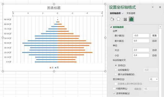 Step-03:选中上方的横坐标轴,打开【设置数据系列格式】窗格,将边标的【边界】的最小值修改为-6,最大值修改为6,然后再勾选【逆序刻度值】,如下图所示。