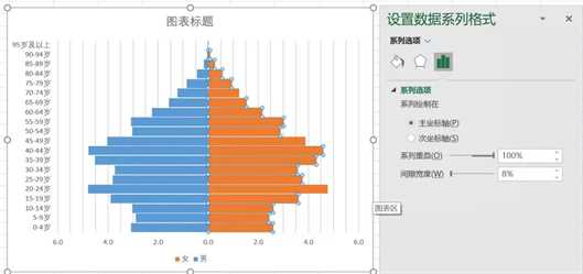 Step-05:分别选中两个系列,将【系列重叠】与【间隙宽度】均分别个忙为100%与8%。如下图所示: