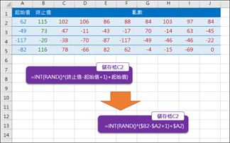 因为 RAND 函数可以产生大于或等于 0 且小于 1 的随机数值,所以将随机数乘以某一个数,即可放大随机数值,而如果要产生的是整数,则藉由 INT 函数来去除小数部分。