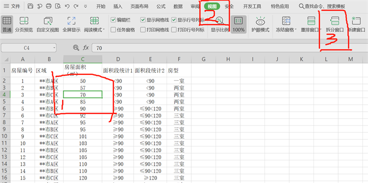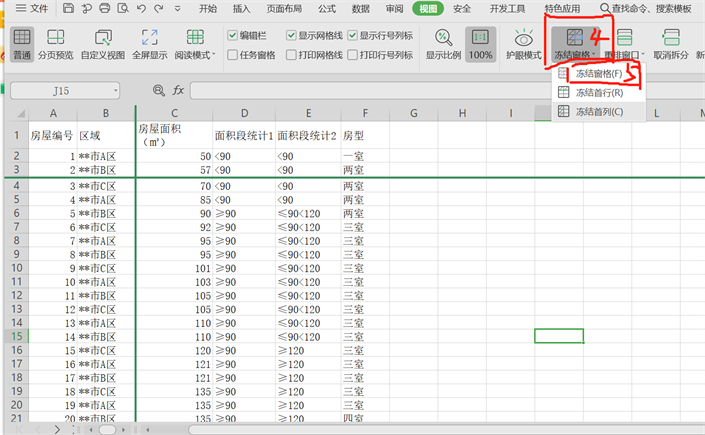 如果需要同时固定显示首行和首列,或者显示前面几行和前面几列,比如我们需要固定显示示例表格的前面3行和前面2列,则操作步骤如下。