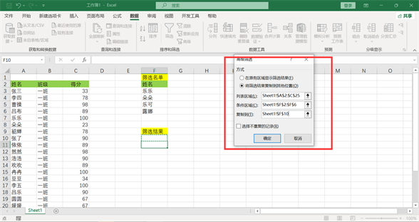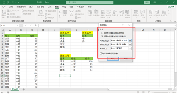 点击菜单栏上“高级筛选”,弹出窗口,勾选“将筛选结果复制到其他位置”,下方“列表区域”选择原始表格区域,“条件区域”选择F列设置的筛选名单,“复制到”点击选择目标位置。