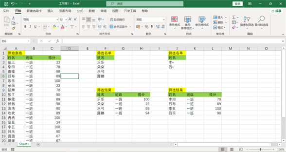 多个姓名筛选时,也可以使用通配符,筛选出符合某一个共同特征的数据,如李姓或吕姓的人员名单,修改筛选条件,同上一样的操作。