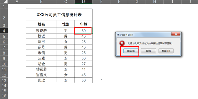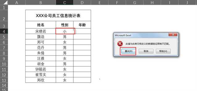 步骤8、这时,员工们输入年龄时则无法随意输入了,也防止信息有误了。如下图所示: