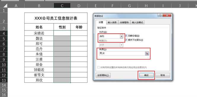步骤3、然后在【数据验证】对话框中的【验证条件】处选择【序列】,并在【来源】这里输入“男,女”(注意:这里的逗号需要是英文输入法状态下输入的),如下图所示: