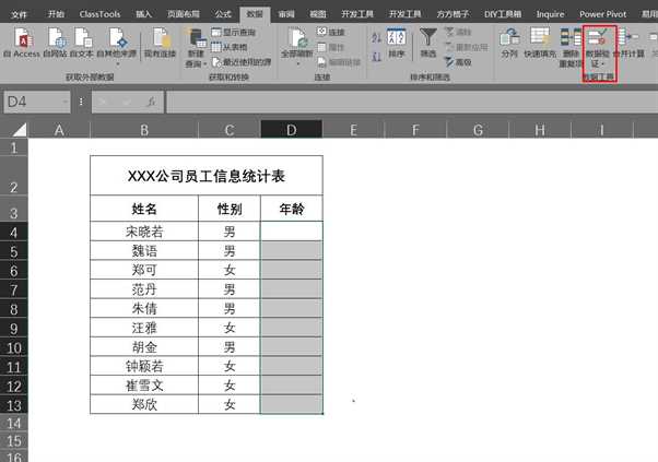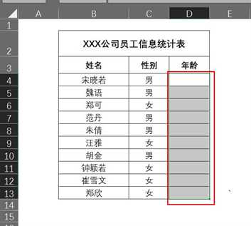 步骤6、已知该公司员工年龄均在25岁至59岁之间,所以可以提前在【年龄】数据列设置限制条件防止信息填写有误的情况,那么首选需要选中【年龄】数据列,如下图所示: