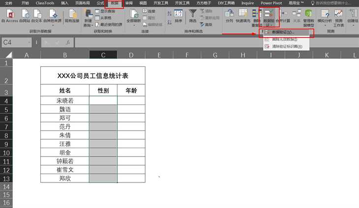 步骤2、选择Excel表上方的【数据】,然后点击【数据验证】并选择其中的【数据验证】,如下图所示: