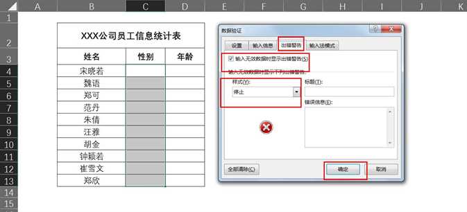 步骤4、在【数据验证】对话框中选择【出错警告】,并在【输入无效数据时显示出警告】前面打勾√,【样式】选择【停止】,然后【确定】即可,如下图所示: