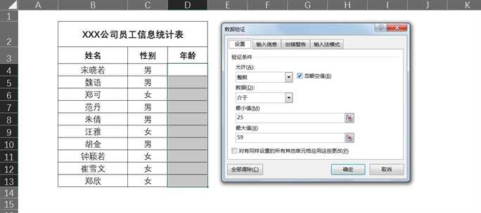 步骤7、选择Excel表上方的【数据】,然后点击【数据验证】并选择其中的【数据验证】,然后在【数据验证】对话框中的【验证条件】处选择【整数】,数值范围根据实际需要填写即可,这里举例的是限制年龄在25岁至59岁之间,所以数值介于25至59,输入完点击确定即可。如下图所示: