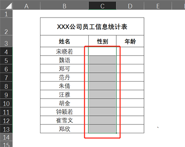 步骤1、首先在【性别】数据列设置好下拉菜单,让员工们直接从下拉菜单中选择设置好的数据即可,如果随意填写将无法保存。那么首选需要选中【性别】数据列,如下图所示: