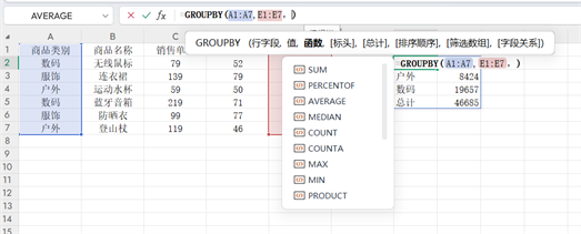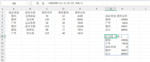GROUPBY函数最基本的用途是对数据进行分类汇总。例如,要按照“商品类别”对“销售总价”进行求和,所使用的公式如下: