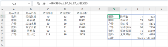 GROUPBY函数的厉害之处在于,它不仅可以对单一列进行分组汇总,还支持多个字段的多层级汇总。例如,要同时按照“商品类别”和“商品名称”对“销售金额”求平均值,公式如下: