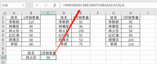 下面来看看如何进行多区域引用,比如这里要引用林义珍2月销售量,可以在单元格中输入公式=INDEX((A2:B7,D2:E7,G2:H7),MATCH(B10,A2:A7,0),2,2)