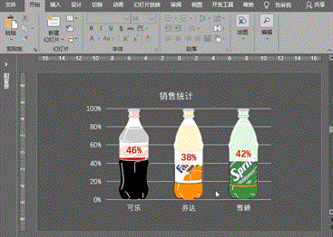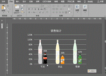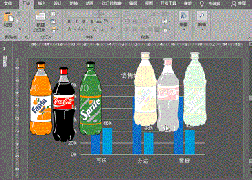选择灰色可乐图片,Ctrl+X剪切之,选择可乐的辅助柱形,Ctrl+V粘贴之;同理将销售率柱形替换彩色可乐图片;