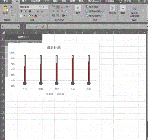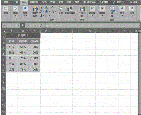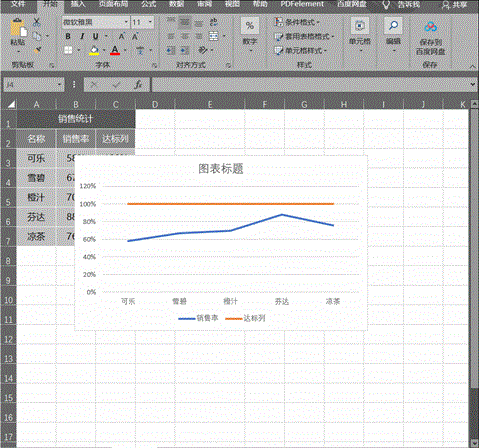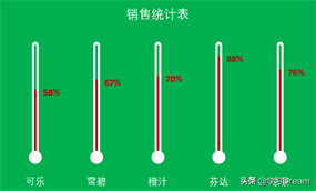 原始数据为可乐、雪碧、橙汁、芬达、凉茶这几种饮料的销售统计,其中第1列数据为真实的销售百分比,第二列为达标列,均为100%。