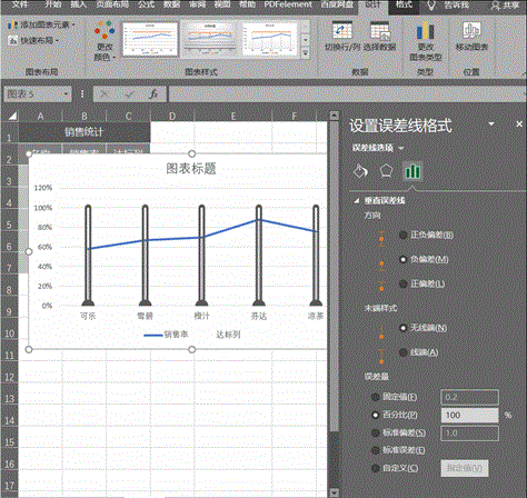 选择销售率折线,点击“设计”菜单-“添加图表元素”按钮-“误差线”-“其他误差线选项”;