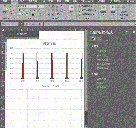 双击达标列的直线,打开右侧“设置数据系列格式”设置项中,“填充”中设置线条为“无线条”;